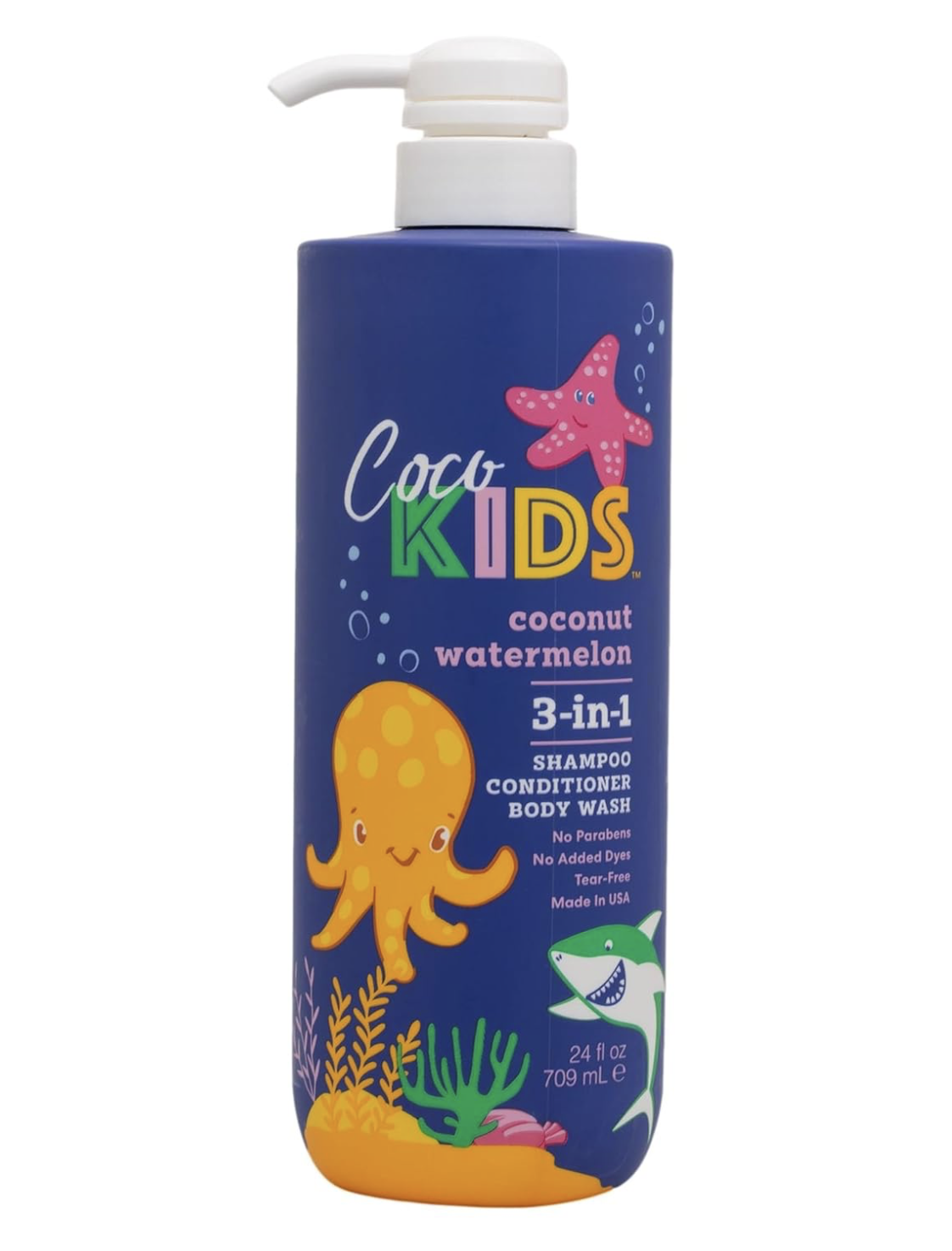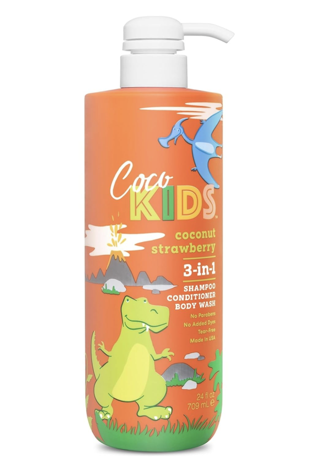 Cocomagic Cocokids 3-in-1 (24 fl oz, 1.8 lbs) tear-free, gentle cleanser for kids. Coconut strawberry scent, paraben-free. Made in USA. 1-year warranty.